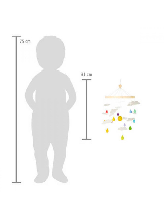 Produkt zbudowany jest z naturalnych elementów drewna, lakierowanych w taki sposób, aby zachować widoczność słojów drewna. Kolory tęczy współgrają z bielą i naturalnym drewnem, tworząc spokojną i przyjazną atmosferę w pokoju dziecka. Okrągłe, miękkie kształty chmurek i kropli deszczu nie tylko cieszą oko, ale również pomagają utrzymać płynny, uspokajający ruch obrotowy karuzeli.