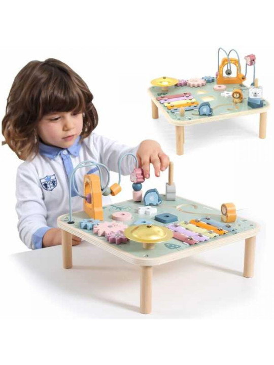 Viga PolarB Stół Stolik Edukacyjny to innowacyjna i angażująca zabawka dla dzieci od 18 miesiąca życia, zaprojektowana z myślą o rozwoju ich umiejętności motorycznych i sensorycznych. Ten drewniany, kolorowy stolik edukacyjny zachęca do kreatywnej i interaktywnej zabawy, jednocześnie wspierając rozwój manualny, koordynację ręka-oko oraz zdolności poznawcze.