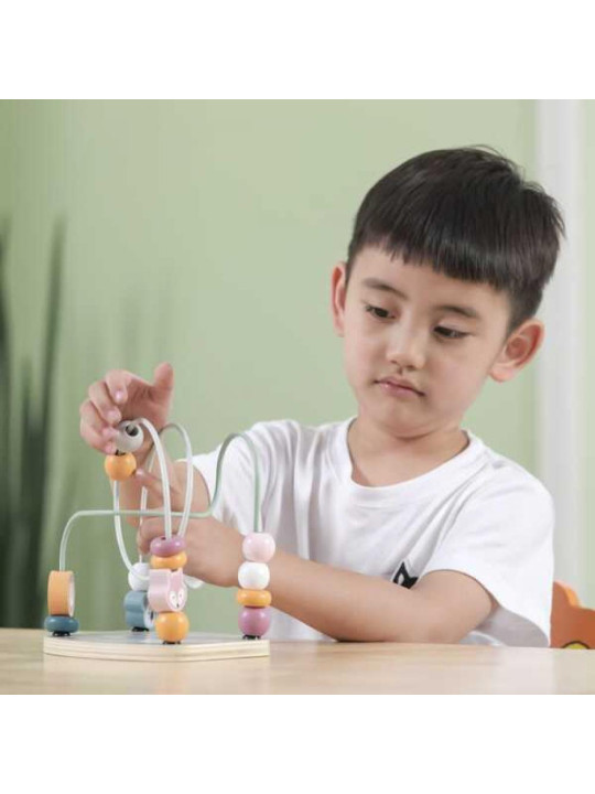 Produkt składa się z solidnej drewnianej podstawy w szarej kolorystyce, na której umieszczone są cztery zakręcone rurki z kolorowymi koralikami i bloczkami w kształtach zwierzątek, takich jak lew, lisek i koala. Przesuwanie koralików wzdłuż rurek gwarantuje wiele godzin wesołej i rozwijającej zabawy.