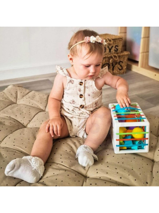 Każdy z klocków do sortera wyróżnia się inną teksturą, kolorem i kształtem, co pobudza ciekawość dziecka i zachęca do wielokrotnego eksperymentowania. Dzięki wyjątkowej konstrukcji kostki wyposażonej w elastyczne gumki, dziecko uczy się, jak precyzyjnie wkładać i wyjmować elementy z kostki. Taka forma zabawy angażuje malucha i wspiera jego rozwój sensoryczny i umysłowy.