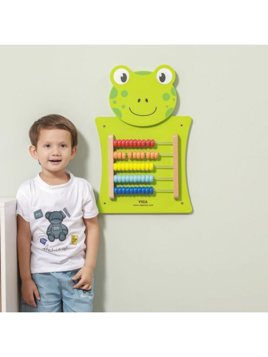 Liczydło składa się z pięciu sznureczków zawieszonych na tabliczce w kształcie uroczej, zielonej żabki. Na każdym sznureczku znajdują się kolorowe drewniane krążki, które dzieci mogą przesuwać z jednej strony na drugą, ucząc się zasad matematyki. Jasne kolory i przyjazny wygląd liczydła przyciągają wzrok dziecka, zachęcając je do zabawy i nauki.