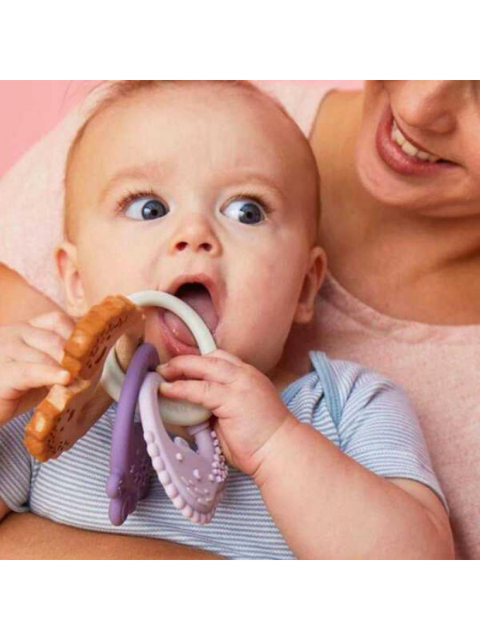 • wiek: 3m+ w opakowaniu: 2 gryzaki silikonowe, 1 gryzak drewniany, 1 pierścień łączący;