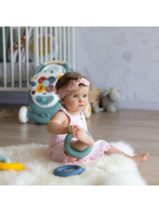 Kółka są utrzymane w stonowanej, wielobarwnej kolorystyce, co dodatkowo przyciąga uwagę dzieci i zachęca je do zabawy. Zaokrąglone kształty elementów zapewniają pełne bezpieczeństwo i komfort podczas zabawy, a ergonomiczny rozmiar jest idealnie dostosowany do małych rączek dzieci, ułatwiając chwytanie i manipulowanie elementami.