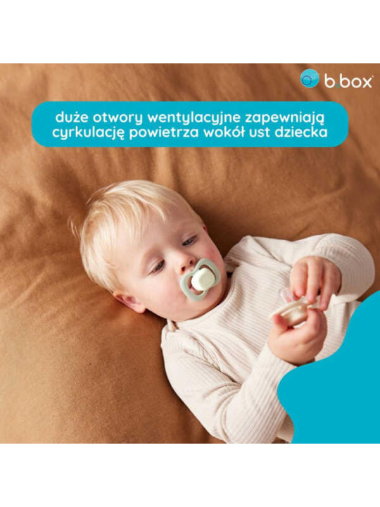 Przemyślana konstrukcja oraz zastosowany materiał pozwalają szkrabowi na swobodne oddychanie, gwarantując bezpieczeństwo. Optymalny rozmiar smoczka został dostosowany do kształtu jamy ustnej niemowlaka. Dodatkowo symetryczna tarcza umożliwia użycie po obróceniu o 180 stopni, co czyni b.box smoczkiem uniwersalnym.