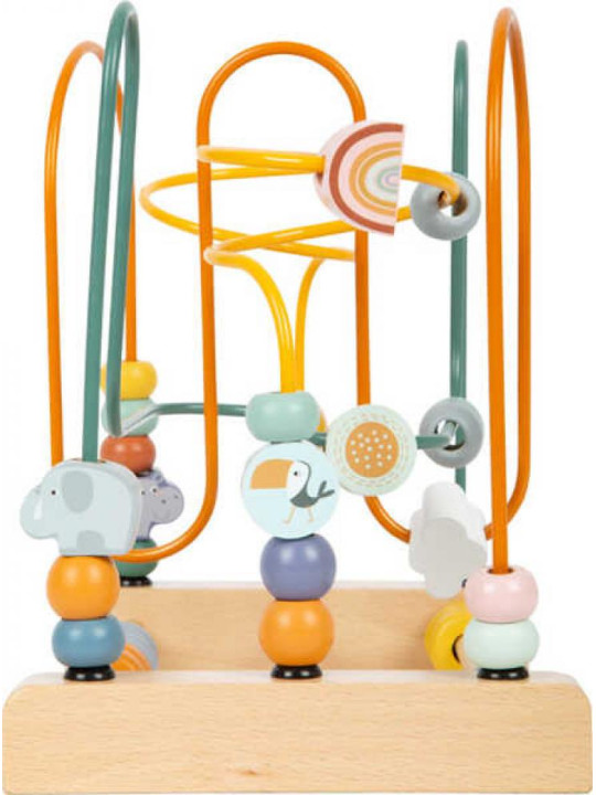 Zabawka składa się z trzech kolorowych metalowych drutów o różnych kształtach, po których dzieci mogą przesuwać drewniane koraliki ozdobione motywami safari. Podstawa wykonana jest z wysokiej jakości drewna, co dodaje uroku i stabilności całej konstrukcji.