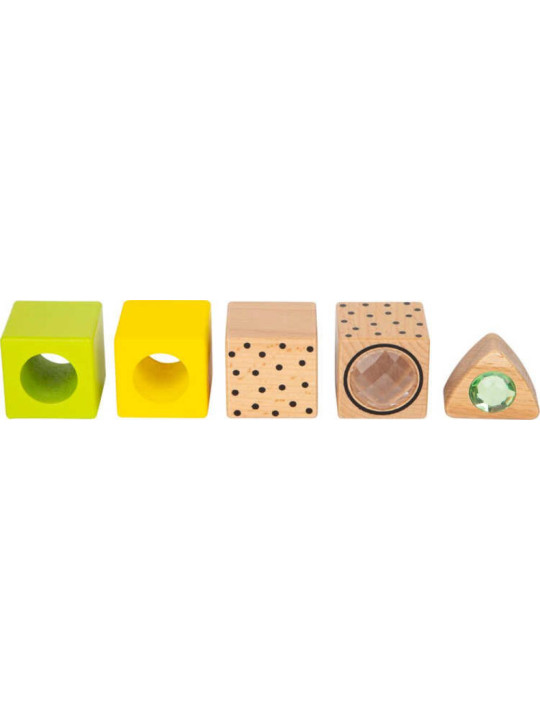 Klocki wyposażone są w efekty wizualne i haptyczne, takie jak grzechotki, pryzmaty, żywe kolory, różne tekstury, oraz ruchomy pociąg. Każdy element ma na celu stymulowanie zmysłów dziecka i dostarczanie im niekończącej się frajdy.