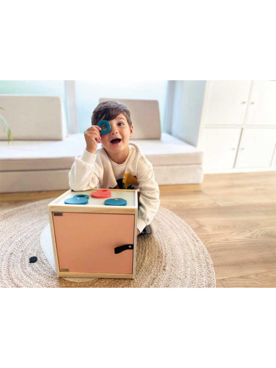 Pudełko ma solidny, drewniany sześcienny kształt i występuje w atrakcyjnych kolorach: pomarańczowym oraz niebiesko-zielonym. Jest ono wyposażone w trzy różnokolorowe elementy na górnej powierzchni: dwa niebieskie koła i jedno czerwone kółko. Te elementy można przesuwać lub wyciągać, co angażuje dzieci w zabawę oraz rozwija ich koordynację ruchową.