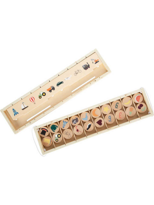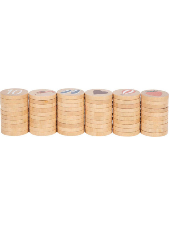 • Stosy okrągłych drewnianych żetonów z różnymi obrazkami, przedstawiające przedmioty i zwierzęta, takie jak owieczka, lew, miś, flaming, delfin, pingwin, arbuzy, grzyb, truskawki, marchewka.