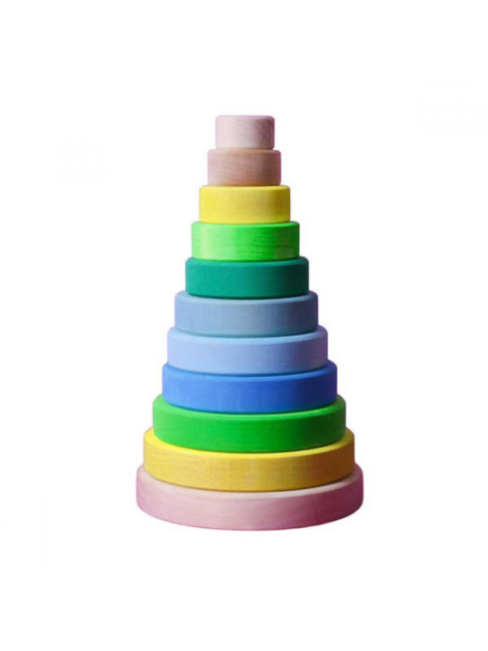Stożkowa wieża to klasyka wśród zabawek dla najmłodszych. Jej unikalność tkwi w prostocie i doskonałym wykonaniu. Drewniane krążki zostały tak wyszlifowane i wykończone, by ich dotykanie było prawdziwą przyjemnością. Są aksamitnie gładkie, ciepłe i miękkie. Wieża to oczywiście nie tylko walory estetyczne. To przede wszystkim świetna zabawka. Dziecko może układać ją na różne sposoby np. zrezygnować z podstawki i bawić się krążkami oddzielnie, ale też łączyć je z innymi klockami i zabawkami Grimm's. Podczas wszystkich tych aktywności maluch trenuje swoje zdolności manualne, uczy się precyzji ruchów i rozwija wyobraźnię.