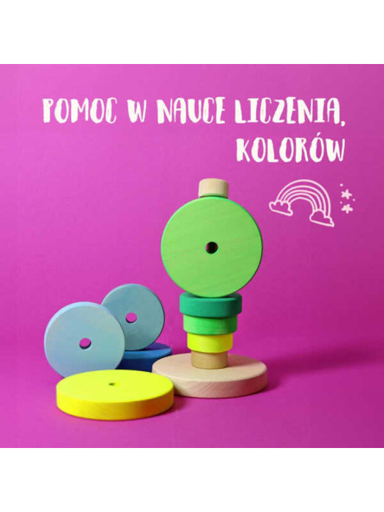 • Skład zestawu: 10 drewnianych krążków nakładanych na drewnianą podstawkę z drążkiem
