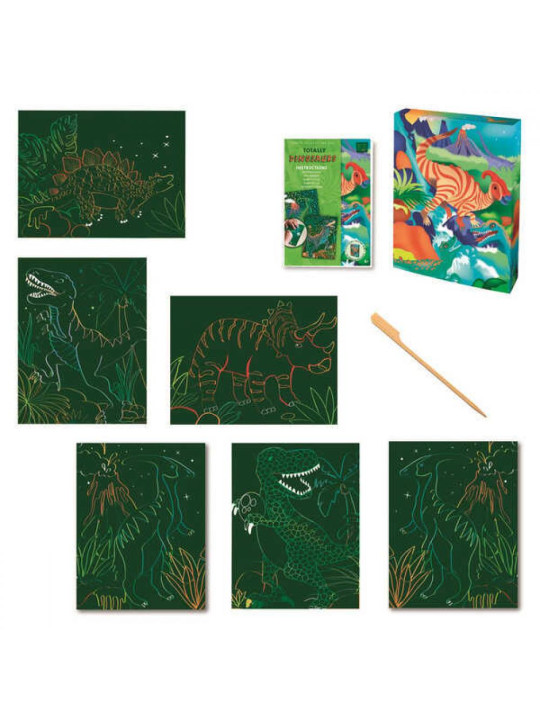 Zestaw artystyczny zawiera 6 dużych kart zdrapek z unikalnymi dinozaurami oraz patyczek do zdrapywania, co umożliwia stworzenie własnych, oryginalnych dzieł sztuki. Dzieci mogą cieszyć się kreatywną zabawą, tworząc kolorowe obrazy poprzez zdrapywanie specjalnej powierzchni kart.