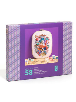 Atelier Grands Augustins - kolekcja zestawów artystycznych dla dorosłych - prezentuje technikę haftu koralikowego. Odkryj sztukę  wyszywania krok po kroku, we własnym tempie i w domowym zaciszu. Zestaw Atelier 58 zawiera wszystkie niezbędne narzędzia i akcesoria do stworzenia własnego obrazu na płóciennym tamborku przedstawiającego kwiatowy wzór. Haft koralikowy polega na starannym naszywaniu koralików i cekinów na napiętą tkaninę płócienną. Za pomocą igły każdy koralik jest precyzyjnie umieszczany na płótnie z nadrukowanym wzorem.  W zestawie znajduje się kod QR, który prowadzi do video tutorialu, objaśniającego technikę krok po kroku. Autentyczne profesjonalne narzędzia zapewniają precyzję ruchów. Drewniana obręcz z zawieszką znajduje się w zestawie, dzięki czemu powstałe dzieła można od razu wyeksponować. Wszystkie akcesoria są zapakowane w pięknie ilustrowane pudełko do przechowywania całej zawartości, w momencie niekorzystania z zestawu. Nazwa kolekcji AGA (Atelier Grands Augustins) nawiązuje do historycznej lokalizacji firmy Djeco, która swoje pierwsze kroki stawiała w paryskiej dzielnicy Saint-Germain-des-Prés, kilka kroków od studia Picassa. Zestawy artystyczne dla dorosłych od Djeco to odpowiedź na rosnący na popularności trend zabawek kidult oraz filozofii well-being. Samodzielne wykonywanie zadań artystycznych poprawia zdolność koncentracji, wycisza i daje poczucie głębokiego relaksu. Jest to doskonały sposób na spędzenie długich zimowych wieczorów, w oderwaniu od ekranów. Malowanie, wyszywanie lub układanie mozaik to świetny trening manualny. Elementy zestawu zostały wykonane z papieru i kartonu posiadającego certyfikat FSC®. Zawartość:- 1 drewniany tamborek- 1 płótno ze wzorem- 1 para nożyczek do haftu- 13 pudełeczek z koralikami i cekinami- 1 podkładka na koraliki- 2 igły/ 1 nawlekacz/ 2 szpulki złotej nici- 1 wzór- Ulotka i karta z kodem QR, prowadzącym do przewodnika video, prezentującego aktywność. Wiek: 15-99 lat Wymiary produktu: 26 x 20 x 1 cmWymiary opakowania: 24,5 x 31 x 3,5 cm