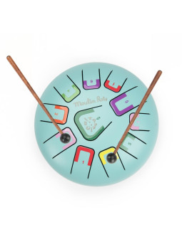 Bębenek językowy z kolekcji Puce & Pilou Dźwięki wydobywające się z bębenka to prawdziwa uczta dla uszu. Delikatne, melodyczne, kojące... Bębenek językowy francuskiej firmy Moulin Roty to doskonały instrument do wprowadzenia dziecko w świat muzyki i rytmu. Można na nim grać za pomocą dłoni lub załączonych do zestawu pałeczek perkusyjnych. Nuty oznaczone są numerami i kolorami. W ćwiczeniach pomoże załączona książeczka. Można ją wygodnie postawić i przekładać kartki znajdujące się na spirali. Instrument nie wymaga użycia baterii. Aby zagrać melodię z dołączonej książeczki, wystarczy dopasować kolor pod nutką do koloru na jednym z "języków" bębenka. Starsze dzieci mogą korzystać z liczb, również tam umieszczonych. Zawartość:- 1 bębenek językowy,- 1 futerał,- 1 książeczka na spirali do postawienia,- 2 pałeczki perkusyjne, Wiek: 3-11 Materiał: stal węglowa, guma, drzewo bukowe Można czyścić miękką i wilgotną ściereczką Wymiary produktu: 20 x 20 x 11 cm  Produkt posiada oznaczenie CE.