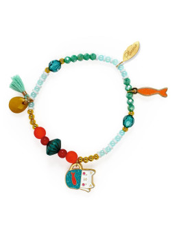 Kolekcja PLUME to zestawy biżuterii i akcesoriów do włosów od marki Djeco. Wykonane z wysokiej jakości materiałów ozdoby ucieszą niejedną małą elegantkę. Akcesoria są podzielone tematycznie według sześciu różnych motywów. Temat przewodni KOTKI przedstawia bransoletkę Amaya. Posiada emaliowane charmsy ze stali nierdzewnej w kształcie kotka w kubeczku i rybki oraz lekkie i wytrzymałe akrylowe koraliki w odcieniach błękitu i czerwieni. Złote dodatki i delikatne wykończenie bransoletki dodadzą dziecięcemu nadgarstkowi nuty elegancji. Podwójna elastyczna gumka jest odporna na zerwanie i na tyle rozciągliwa, aby dziecko swobodnie mogło założyć bransoletkę na rękę bez konieczności posiadania zapięcia. Do każdej bransoletki dołączona jest zawieszka w kształcie listka z nazwą kolekcji. Zawartość:- 6 bransoletek na osobnych kartonowych i ilustrowanych zawieszkach Wiek: 3+ Średnica produktu: 5 cm Wymiary opakowania: 5,5 x 14 x 1 cm Opakowanie zbiorcze: 6 szt.