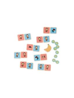 W skład zestawu wchodzą: 16 kart 8 x 8 x 0,6 cm, 8 żetonów 4 x 1 cm, 1 trofeum bananowe 9,5 x 7 x 1,2 cm,  materiał: drewno.