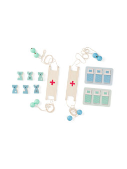 W skład zestawu wchodzą: 2 x nosze 20 x 6 x 1 cm, 2 x łóżko 16 x 10 x 0,6 cm, 6 psów 5 x 3 x 2 cm.
