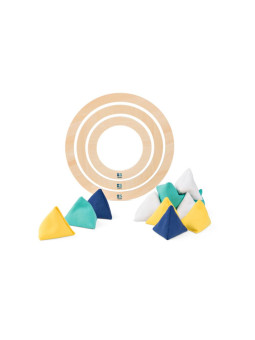 Celem gry TRIGO jest wrzucenie jak największej liczby woreczków o trójkąta utworzonego z trzech drewnianych obręczy.