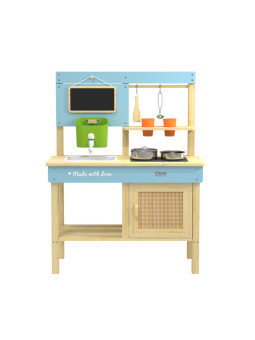Naśladowanie dorosłych to dla dzieci fantastyczna zabawa! Drewniana kuchnia błotna marki Classic World to idealna zabawka dla małych miłośników gotowania na świeżym powietrzu! Zaprojektowana z dbałością o szczegóły, wykonana z naturalnego certyfikowanego drewna, z uroczymi pastelowymi akcentami – stworzona, by rozwijać kreatywność, zdolności manualne i wyobraźnię dziecka poprzez zabawę w dorosłe życie. Zabawka może służyć smykowi do zabawy w restaurację lub sklep. Można ją wykorzystywać na mnóstwo różnych sposobów, a kreatywnej rozrywce nie ma końca! Zbiornik z kranikiem umożliwia obieg wody, dzięki czemu dziecko może bawić się w gotowanie, mycie naczyń lub mieszać błotko.