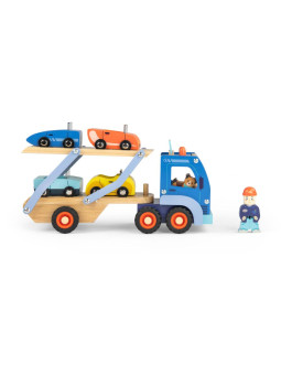 Drewniana laweta na cztery samochodziki z kolekcji Avenue du Moulin, idealna do zabawy na role. Piętrowa przyczepa rozkłada się na płasko, umożliwiając autkom bezpieczny zjazd. W zestawie znajdują się dodatkowo drewniana figurka pracownika, pieska i cztery samochodziki kabriolety. Wiek: 3+ Wymiary: 29,5 x 12 x 16 cm Materiał: drewno bukowe, metal, plastik Produkt posiada oznaczenie CE.