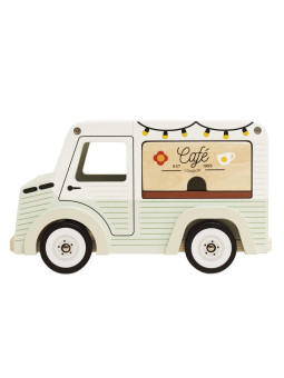 Kawiarnia w stylu retro jest wyposażona w podnoszony dach z menu, słodkie okienko do podawania kawy i herbaty, markizę oraz drewnianą tacę do serwowania. Jej rozmiar idealnie pasuje do gamy drewnianych lalek, akcesoriów oraz pięknych, wielokrotnie nagradzanych domków dla lalek marki Le Toy Van. Czas spędzony z tym klasycznym, miniaturowym samochodzikiem - kawiarnią jest najsłodszy!