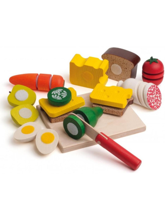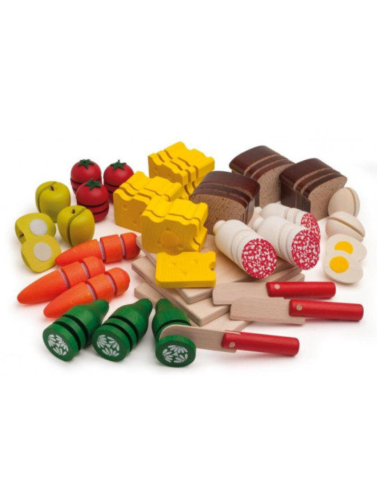 Drewniany Zestaw akcesoriów spożywczych na rzep do krojenia i zabawy 27 elementów Erzi