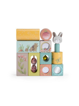 Zestaw 11 drewnianych klocków konstrukcyjnych z niespodziankami: lusterkiem, dzwonkiem, kuleczkami. Dzieci układając klocki, odkrywają elementy wydające dźwięki lub odbijające światło. Zabawka rozwija spostrzegawczość, ciekawość i motorykę małą dziecka. Nauka kształtów poprzez zabawę. Kolorystyka zabawki nawiązuje do kolekcji Trzy Małe Króliczki, która utrzymana jest żółto-zielonej kolorystyce. Można czyścić powierzchniowo za pomocą miękkiej, wilgotnej ściereczki. Wiek: +12 mies. Wymiary: 16 x 4,5 x 16 cm Materiał: drewno brzozowe, bawełna, plastik, poliester Produkt posiada oznaczenie CE.