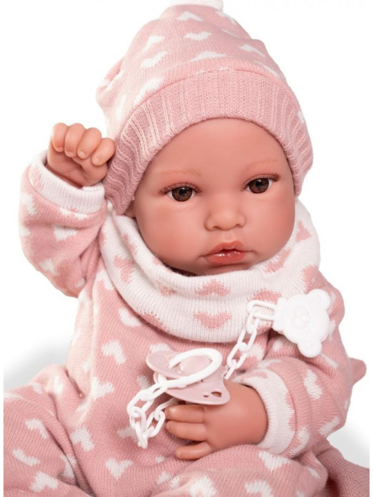 Lalka hiszpańska 50418 marki Antonio Juan to marzenie każdego dziecka, uwielbiającego zabawę w odgrywanie ról. Autentyczny wygląd pozwala z łatwością wcielić się w rolę troskliwego rodzica. Erika ubrana jest w oryginalnie zaprojektowany, ciepły różowy kombinezon w białe serduszka, szaliczek oraz czapeczkę. Zestaw dopełniają skarpetki, kocyk oraz przypinany smoczek na łańcuszku. Strój z łatwością można zdjąć, a bobasa przebrać lub wykąpać.