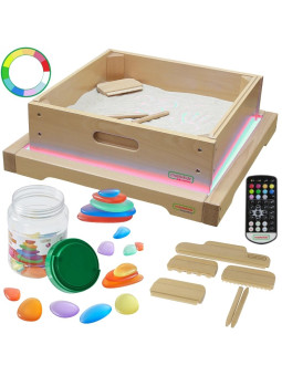 Panel Skrzynia LED Sensoryczna Masterkidz to solidna, drewniana skrzynka z podświetleniem LED emitującym kolorowe światło z możliwością dowolnej konfiguracji dzięki dołączonemu pilotowi, użytkownik może ustawić panel na jeden z 11 zaprogramowanych kolorów, lub ręcznie zmienić emitowany kolor bazując na podstawowych barwach światła: czerwonej, zielonej i niebieskiej. Urządzenie pozwala także na płynne przechodzenie pomiędzy kolorami oraz zapamiętywanie wybranych barw do ponownego użycia. Panel świetlny LED umożliwia różnorodne aktywności wspierające rozwój kreatywności, takie jak mieszanie kolorów czy nauka poprzez system STEM. Efektowne rezultaty uzyskuje się, gdy światło przenika przez różne materiały – liście, papier, tackę z piaskiem czy przezroczystą wodą. Panel idealnie współgra z dołączoną kwadratową tacką do zabawy piaskiem oraz kolorowymi kamyczkami, które dodatkowo wzbogacają doznania sensoryczne.