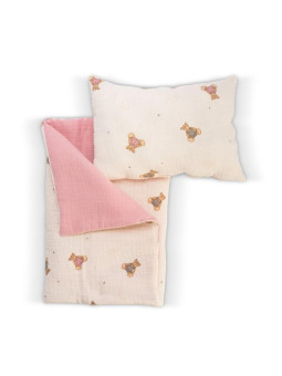 Komplet zdobiony jest z jednej strony słodkimi misiami, z drugiej natomiast urzeka tkaniną w modnym delikatnym różu. Akcesorium z kolekcji hiszpańskiej cenionej marki Asi zapakowane jest w tiulową torebkę, dekorowaną lśniącą satynową kokardką. Świetnie sprawdzi się jako prezent dla dziecka w wieku od 3 lat.