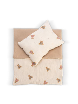 Komplet zdobiony jest z jednej strony słodkimi misiami, z drugiej natomiast urzeka tkaniną w modnym delikatnym beżu. Akcesorium z kolekcji hiszpańskiej cenionej marki Asi zapakowane jest w tiulową torebkę, dekorowaną lśniącą satynową kokardką. Świetnie sprawdzi się jako prezent dla dziecka w wieku od 3 lat.