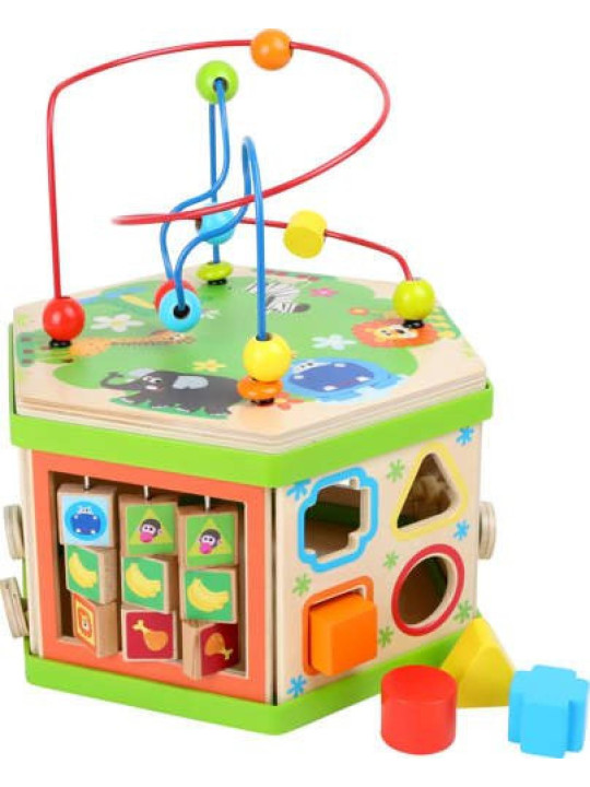 Kostka edukacyjna oferuje 7 różnych powierzchni do zabawy, które zapewniają dzieciom różnorodne aktywności. Na górnej części znajduje się labirynt z koralikami, który pomaga rozwijać koordynację ręka-oko oraz zdolności manualne. Każda z boków kostki to inna przygoda - od liczydła, przez grę z przesuwaniem klocków, po dopasowanie kształtów.