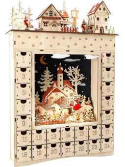 Centralna część kalendarza przedstawia uroczą scenę z Mikołajem, która jest oświetlona diodami LED. Światełka tworzą niezapomniany, świąteczny klimat, wprawiając wszystkich domowników w radosny nastrój. Na samej górze kalendarza znajdują się filigranowe domki oraz postacie, które dodatkowo podkreślają wyjątkowy charakter produktu.