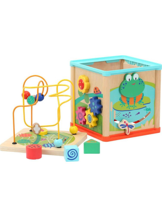 Na każdym boku Kostki motorycznej Small Foot czekają różnorodne wyzwania edukacyjne, takie jak sorter kształtów, kolorowe kółka zębate i zwierzątka, które wzbudzą ciekawość każdego malucha. Górna część kostki to atrakcyjna zjeżdżalnia kulek z kolorowymi koralikami, która doskonale nadaje się do treningu precyzji ruchów.