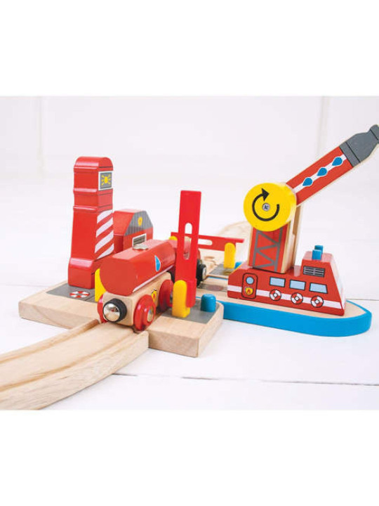 Port strażacki – wspaniały zestaw, wykonany z wyjątkową dbałością o szczegóły. Zestaw kompatybilny z innymi zestawami z serii drewnianych kolejek. Odpowiednie dla dzieci w wieku 3+.