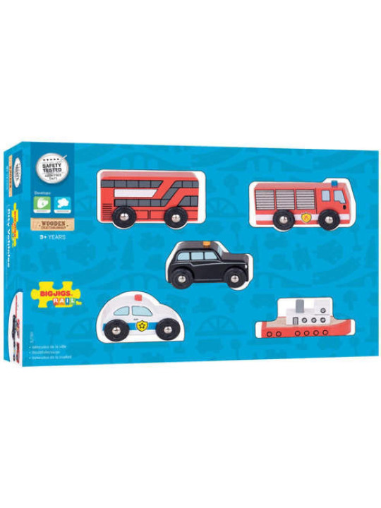 Pojazdy Miejskie dla kolejek drewnianych – to pięć ślicznych pojazdów, cztery samochodziki – z ruchomymi kołami i statek. Można je mieszać z innymi zestawami z serii, są kompatybilne również z innymi zabawkami takich producentów jak Ikea, Brio czy Woodyland. Odpowiednie dla dzieci w wieku 3+.