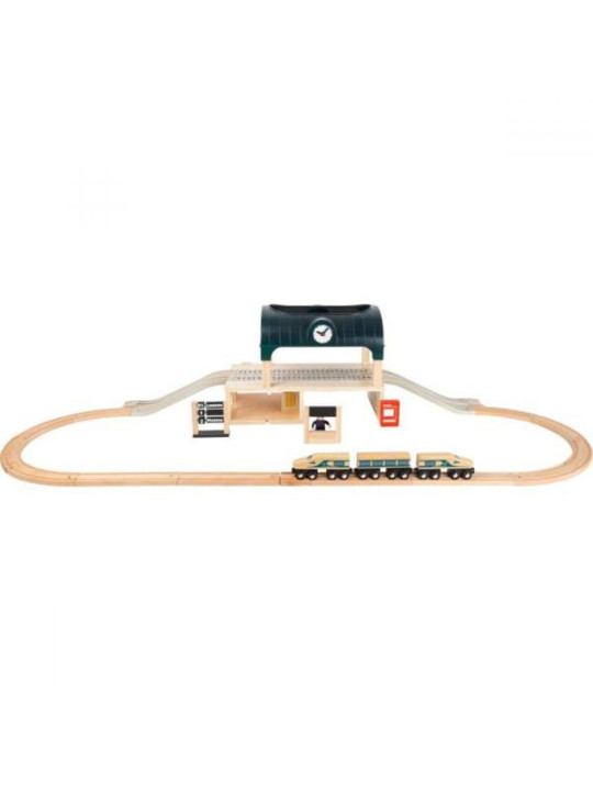 Kolejka drewniana jest wyposażona w dwupoziomowy dworzec kolejowy, który posiada liczne akcesoria takie jak kioski, automaty biletowe, tablica informacyjna, zegar dworcowy oraz drewniany pociąg expressowy. Górne piętro dworca oferuje możliwość położenia dwóch torów kolejowych, natomiast na dolnym poziomie można ułożyć nawet cztery tory koło siebie, co zapewnia ogromne możliwości zabawy.