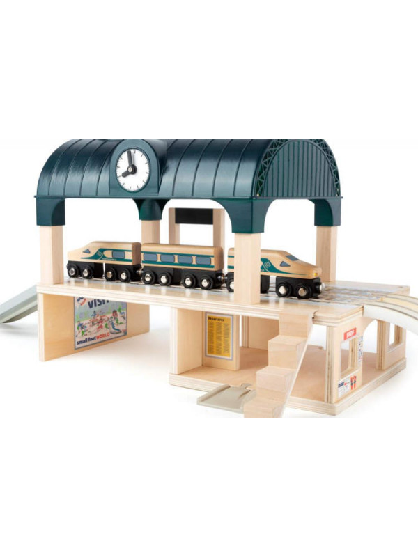 Dzieci mogą cieszyć się przekąską w kiosku, kupować bilety w automatach biletowych lub pisać kredą godziny odjazdu na tablicy informacyjnej. Zegary dworcowe wskazują czas po obu stronach, dzięki czemu żaden pasażer nie przegapi swojego pociągu. Otwarty dach dworca pozwala młodym miłośnikom kolejek na wygodną zabawę wewnątrz. Kolejka jest kompatybilna z innymi popularnymi markami zabawek kolejowych, co daje jeszcze więcej możliwości rozbudowy zestawu.