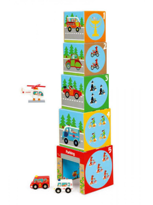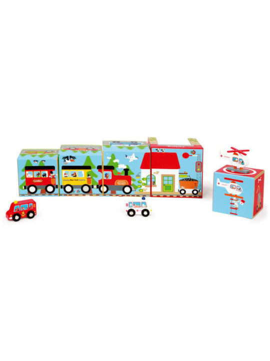 Do zestawu dołączone są drewniane pojazdy - wóz strażacki, karetka oraz helikopter. Największy z klocków pełni funkcję garażu z miejscem postojowym dla wozu strażackiego i karetki, a na samym szczycie wieży znajduje się lądowisko dla helikoptera. Takie rozwiązanie daje dodatkowe możliwości zabawy i pobudza wyobraźnię dziecka.