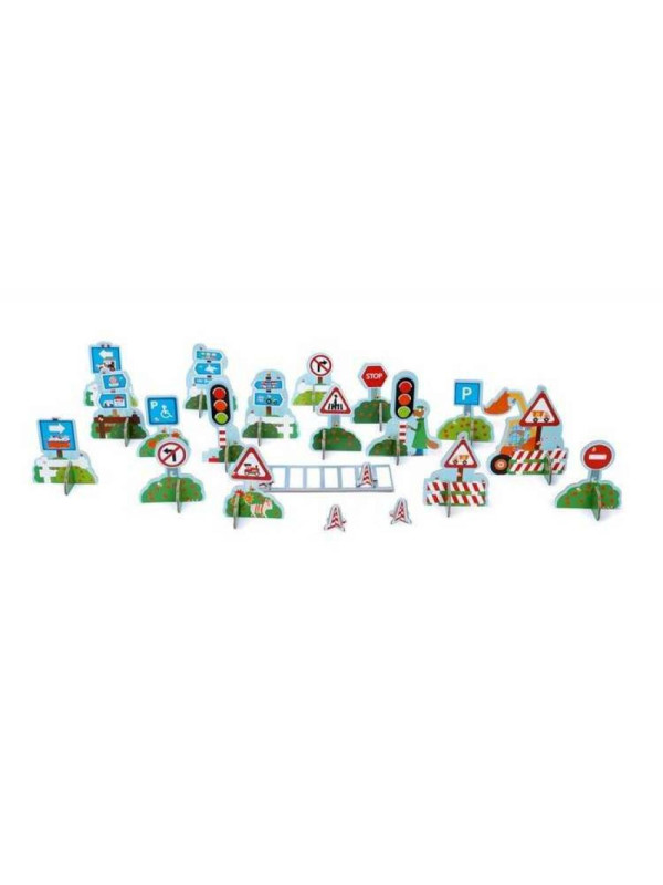 Zestaw składa się z 22 elementów, które można łatwo połączyć, tworząc skrzyżowanie z przejściem dla pieszych, znakami drogowymi oraz sygnalizacją świetlną. Każdy element jest precyzyjnie wykonany z wysokiej jakości tektury, co zapewnia trwałość i bezpieczeństwo podczas zabawy. Produkt jest rekomendowany dla dzieci od 3 roku życia.