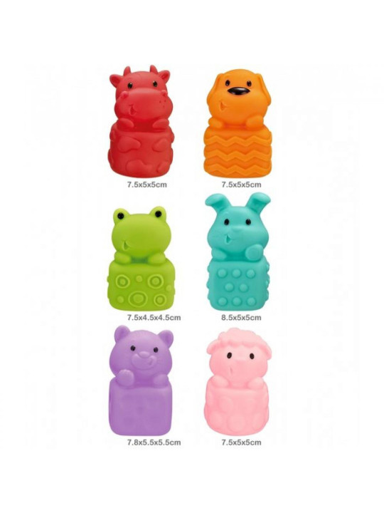 Zwierzątka, takie jak hipcio, owieczka, królik, kotek, żabka i piesek, zostały wykonane z miękkiej, bezpiecznej gumy. Dzięki otworom, każde z nich może psikać wodą, co z pewnością dostarczy wiele radości podczas kąpieli. Dodatkowo, zwierzaki osadzone są na podstawkach wyposażonych w wypustki sensoryczne, co zwiększa ich walory edukacyjne i rozwija zmysł dotyku dziecka.