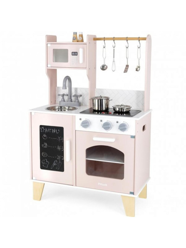 Kuchnia została wykonana z lakierowanego drewna i pomalowana nietoksycznymi farbami, co gwarantuje bezpieczeństwo oraz długotrwałość użytkowania. Kolorystyka utrzymana w "polarnych" barwach zadowoli każdego małego kucharza.
