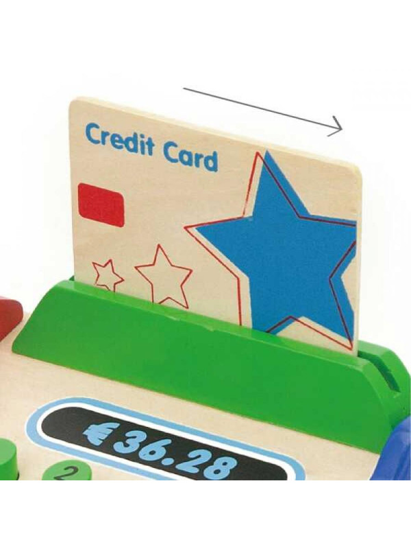 Kasa zawiera 40 drewnianych monet, kartę płatniczą, skaner na sznurku oraz rolkę do "drukowania paragonów". Dzieci mogą uczyć się poprzez zabawę, zgodnie z zasadami nurtu Montessori. Ta drewniana kasa jest nie tylko zabawką, ale też narzędziem edukacyjnym rozwijającym umiejętności matematyczne.