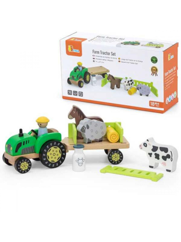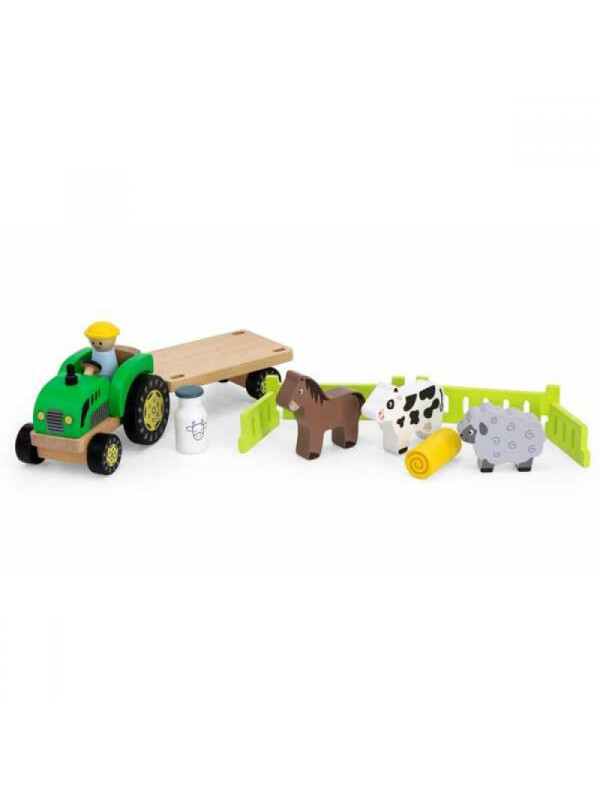 W zestawie znajduje się 11 drewnianych, kolorowych elementów, w tym traktor z kierowcą, koń, owca, krowa, butelka mleka, bela słomy oraz zdejmowane burty przyczepki, które można przekształcić w ogrodzenie farmy. Każdy element jest starannie wykonany i pomalowany nietoksycznymi farbami bezpiecznymi dla dzieci.