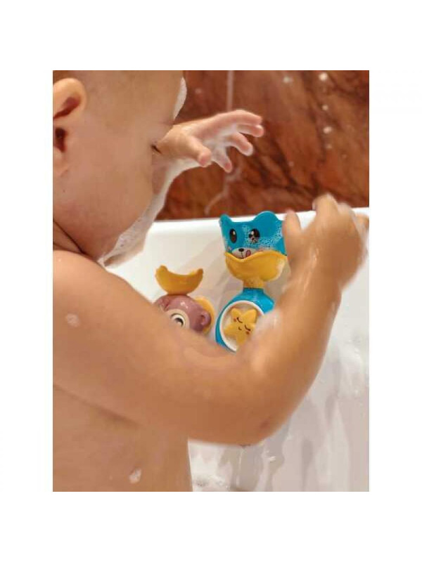 Podczas wlewanie wody do czapki małpki za pomocą dołączonego kubka, oczy małpki zaczynają kręcić się w kółko, a buzia otwiera się i wylewa wodę prosto do wanny. Dodatkowo, z gąsienicy oraz gwiazdki również cieknie woda, która uruchamia kołowrotek, tworząc niesamowity efekt wodnej karuzeli.