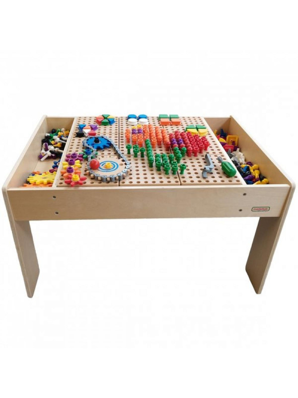 W skład zestawu wchodzi stolik edukacyjny oraz szeroka gama elementów pozwalających na tworzenie różnorodnych konstrukcji. Sam panel o wymiarach 63 x 63 cm jest wyposażony w otwory, w które można wkładać kolorowe i geometryczne kołeczki, śrubki i koła zębate, co umożliwia tworzenie przepięknych wzorów.