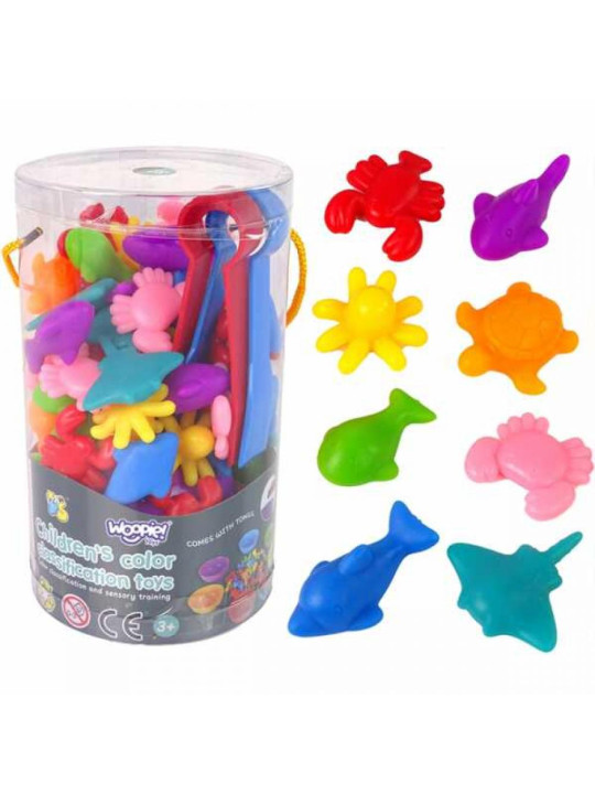 Zabawka edukacyjna Morska Kraina marki WOOPIE to idealne narzędzie do nauki kolorów oraz liczenia. Zestaw zawiera 64 elementy, w tym 56 figurek morskich zwierząt, 6 kolorowych miseczek oraz 2 szczypczyki. Jest to prosty, ale skuteczny sposób na rozwijanie umiejętności motorycznych, logicznego myślenia oraz naukę współpracy i rywalizacji.