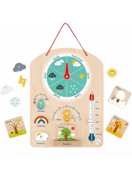 • Drewniana tablica dydaktyczna z pogodą – świetna do nauki dni tygodnia i warunków pogodowych.