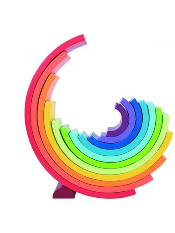 Drewniana tęcza składa się z 12 półkolistych elementów, które można układać w różnorodne wzory według wielkości. Każdy element został pomalowany w inny kolor, co wzbogaca doznania wizualne i pomaga w nauce rozpoznawania i nazywania barw.