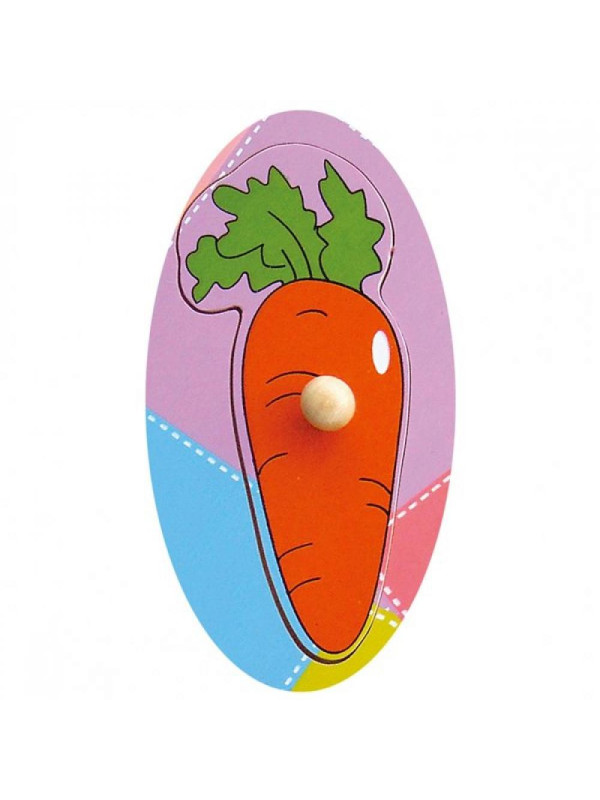 Warzywa przedstawione na puzzlach to kolorowe i realistyczne ilustracje marchewki, ziemniaków, pomidorów i bakłażana. Dzięki intensywnym kolorom zabawka przyciąga uwagę dziecka i zachęca do długotrwałej zabawy. Puzzle są wyposażone w wygodne uchwyty, które ułatwiają dziecku podnoszenie i układanie elementów w odpowiednich miejscach na planszy.