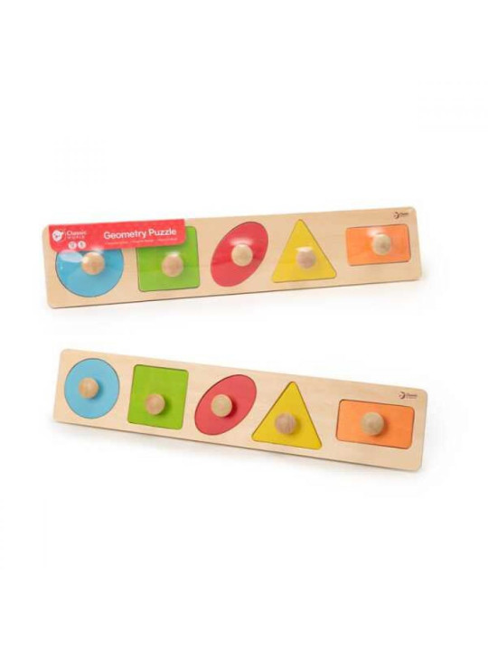 Drewniana układanka z pinezkami od Klasycznego Świata to idealna zabawka edukacyjna dla dzieci od 12. miesiąca życia. Produkt składa się z drewnianej planszy oraz 6 kolorowych elementów tematycznych, które dziecko musi dopasować do odpowiednich kształtów na planszy.